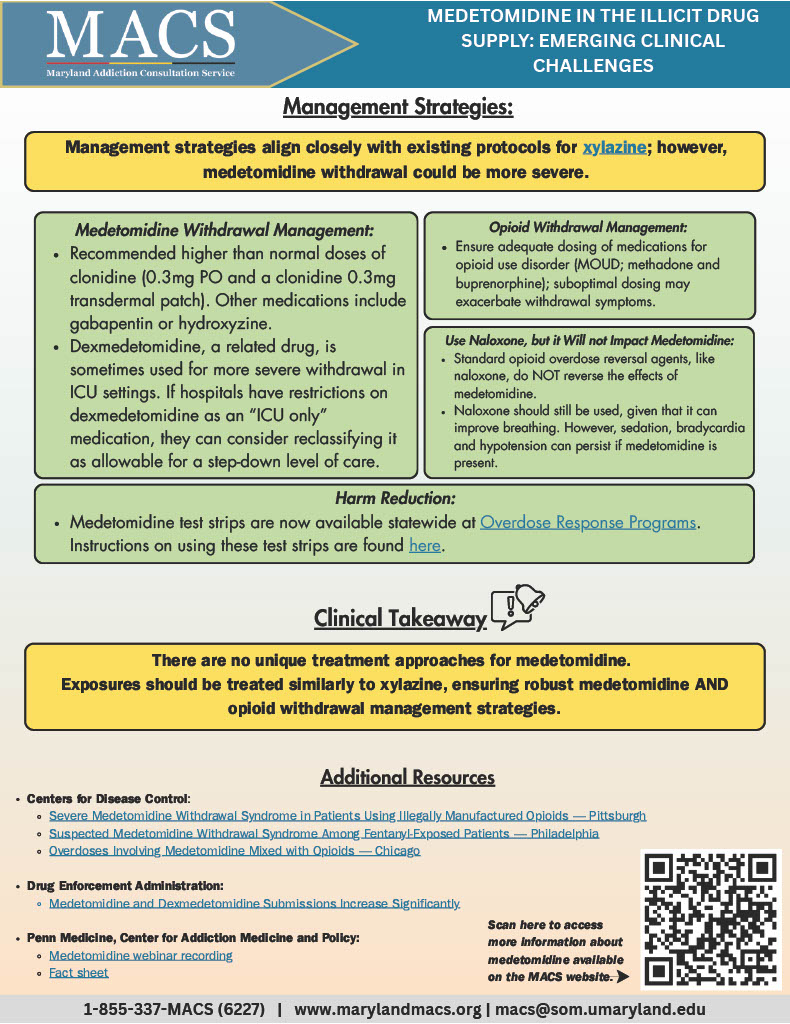 Resources for clinicians can be found here, including withdrawal protocols from Philadelphia Department of Health and a webinar hosted by CDC on clinical implications of medetomidine mixed with opioids. Treating medetomidine withdrawal requires treating fentanyl withdrawal with long-acting opioid agonists like methadone and using adjunctive medications such as: Clonidine, Guanfacine, Tizanidine, Dexmedetomidine, Ketamine, Olanzapine, Hydroxyzine, Benzodiazepines, Prochlorperazine or Chlorpromazine.